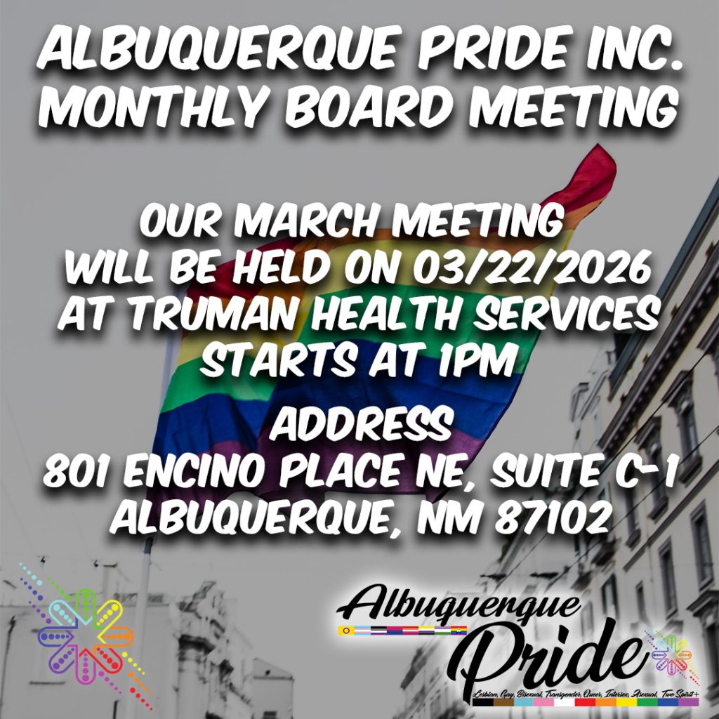 Join us March 22nd, 2026 for Albuquerque Pride Monthly General Meeting at UNM Truman Health Services 801 Encino Place NE, Suite C-1, Albuquerque, NM 87102.